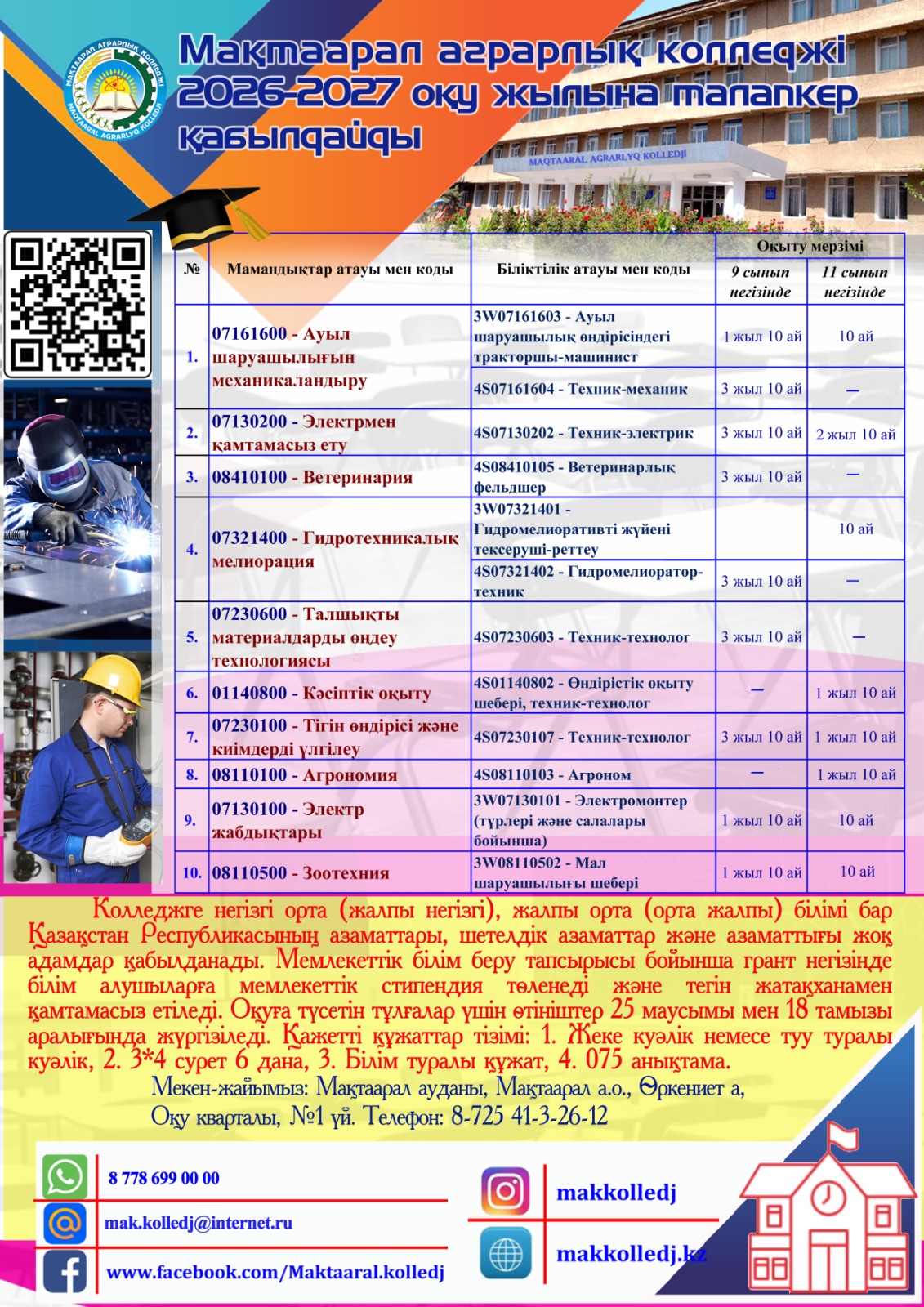 Күндізгі бөлімге: 9-11 сынып бітірушілерін мемлекеттік тапсырыс негізде төмендегі мамандықтар бойынша оқуға қабылдаймыз